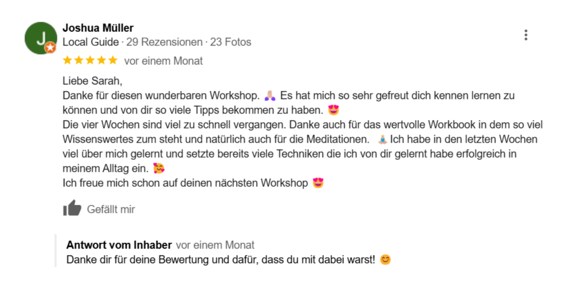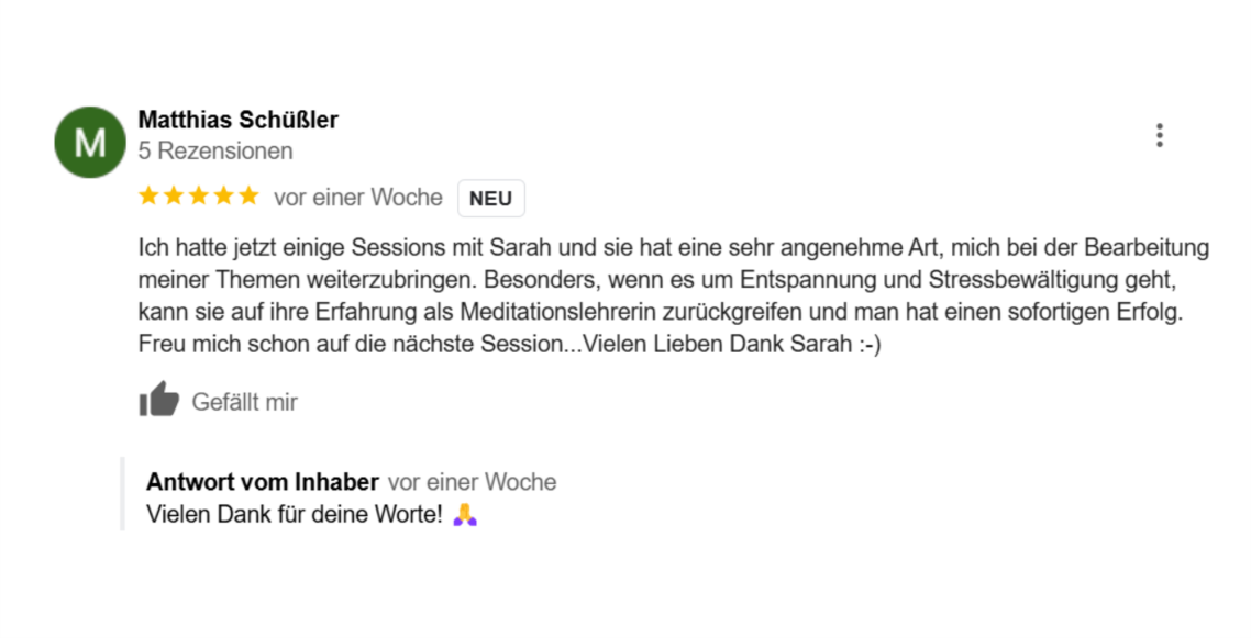 Die Meditationen haben wahnsinnig viel in mir ausgelöst. Ich fand sowohl den theoretischen Teil als auch den praktischen Teil, den wir mit dir üben durften, sehr interessant."